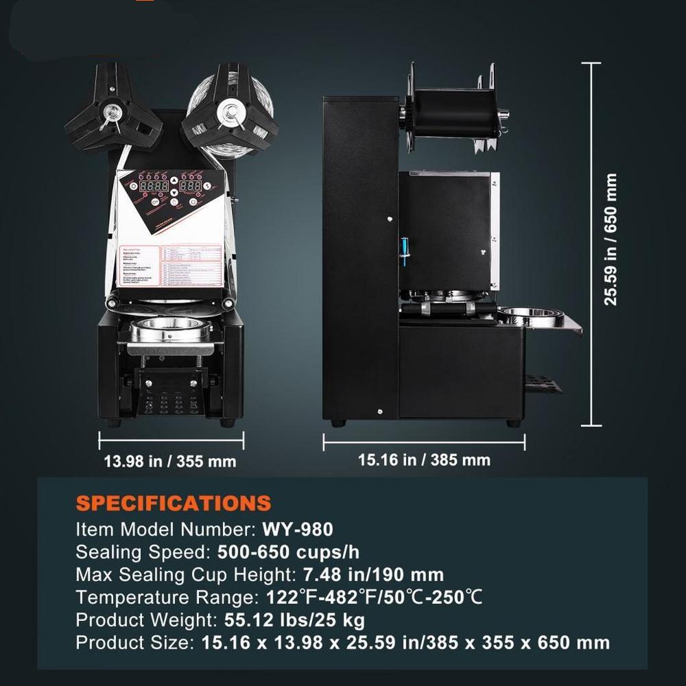Sealing Speed: 500-650 cups/h,Item Model Number: WY-980,Product Weight: 55.12 lbs/25 kg,Max Sealing Cup Height: 7.48 in/190 mm,Temperature Range: 122℉-482℉/50℃-250℃,Product Size: 15.16 x 13.98 x 25.59 in/385 x 355 x 650 mm