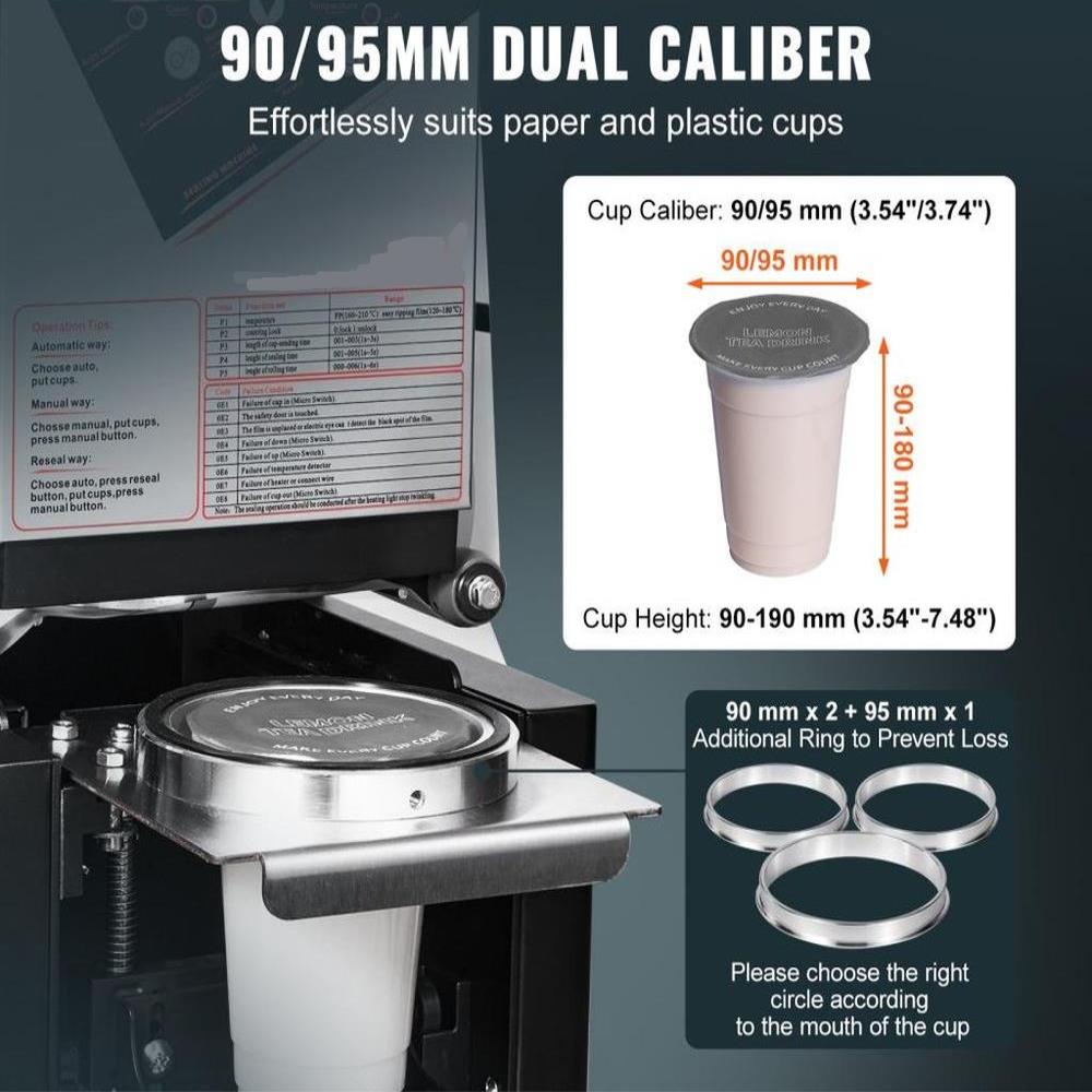 Compatible with 90/95 mm Cups: Our cup sealing machine is compatible with cups ranging from 90 mm to 190 mm in height and 90/95 mm in diameter. Whether they are made of PP/PE/PS materials or paper/plastic cups, this sealer can easily handle them.