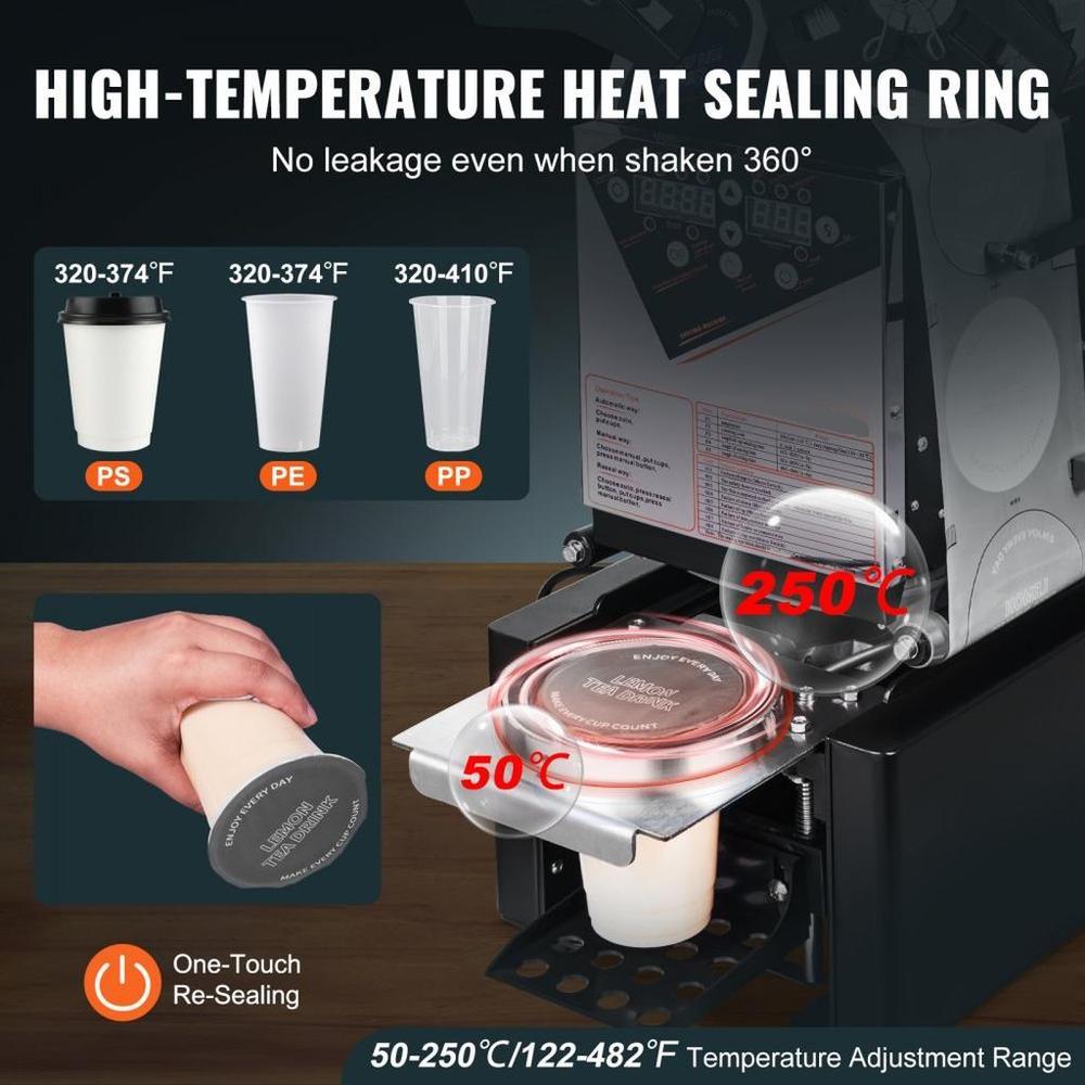 Leak-Proof Sealing: Say goodbye to messy leaks! Our automatic cup sealing machine uses a smart heating ring that adjusts to your cup`s material, ensuring a perfect seal every time. Plus, it`s got a handy one-touch reseal feature for extra convenience.