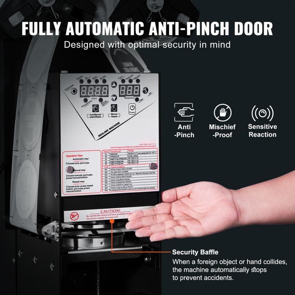 Safe and Anti-Pinch: For your security, our cup sealer machine comes with a built-in security door, automatically stopping operation upon contact with foreign objects or accidental touches. It`s all about peace of mind while you seal the deal.