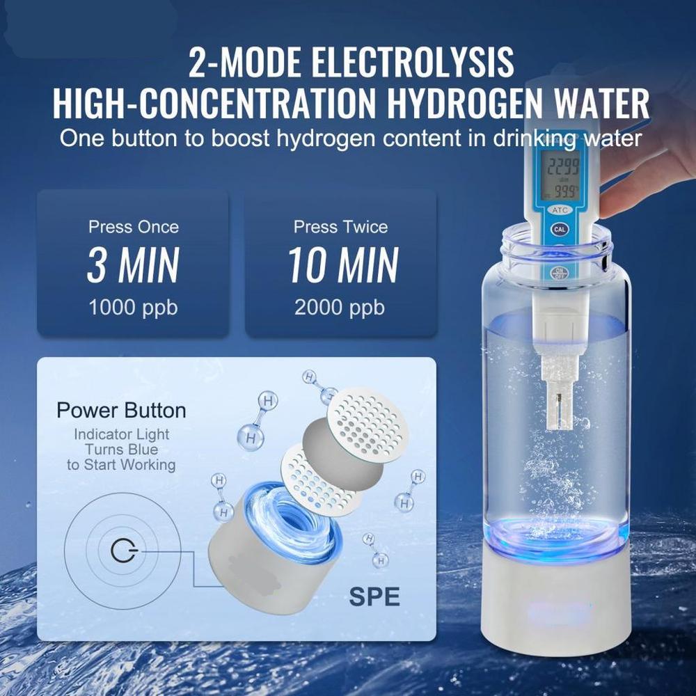 One-Button Operation with 2 Modes: If you have irregular sleep patterns or if your doctor recommends hydrogen water for excessive exercise or recurring inflammation, try our hydrogen water bottle. SPE technology directly electrolyzes water into hydrogen-rich water. Press the switch once to produce 1000 ppb hydrogen in 3 mins or twice to produce 2000 ppb in 10 mins. The indicator light shows hydrogen production and battery status, turning blue during production.