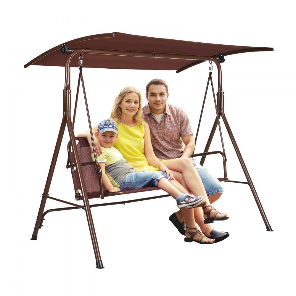 3-Person Patio Swing Chair, Outdoor Patio Swing with Adjustable Canopy, Porch Swing with Armrests, Teslin Fabric and Alloy Steel Frame, for Balcony, Backyard, Patio, Garden, Poolside, Brown