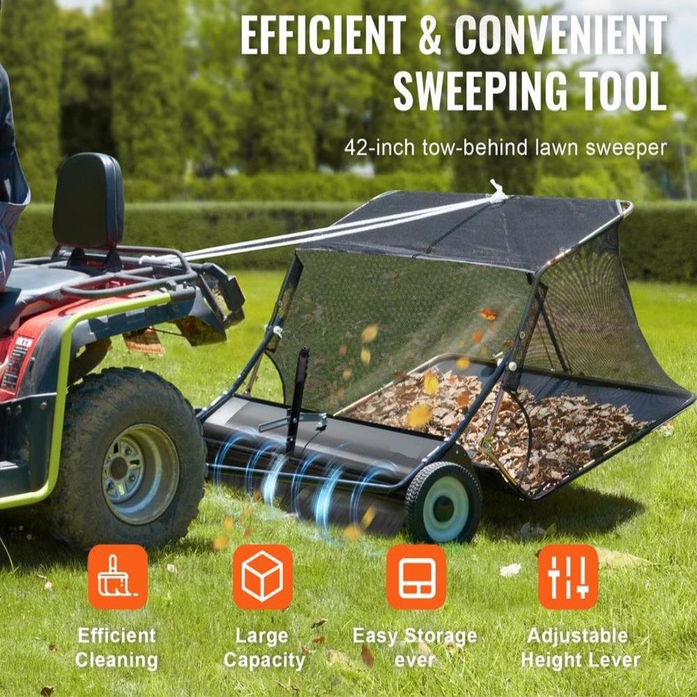42-inch Sweeping Width: Our tow-behind lawn sweeper features a 42" sweeping width, allowing you to cover more area in one pass. Unlike many other models, it widens metal-to-brush connection at the bottom and with a 10.5" diameter brush for enhanced efficiency in removing leaves and grass.