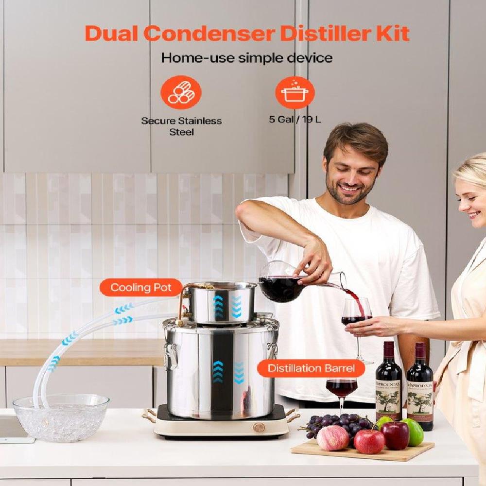 5 Gal Distiller Kit: We provide a complete kit for this distiller, comprising a fermentation barrel, barrel lid, and cooling pot. The kit is made from food-grade materials including stainless steel, silicone, and copper, ensuring direct contact with ingredients. There are 3Gal, 5Gal, 8Gal, and 13.2Gal capacity fermentation barrels to choose from, perfect for gatherings with friends and family.